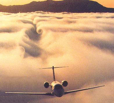 Downwash VorticesA Cessna Citation was flown above a cloud bank over Lake Tahoe at approximately 165 knots. The trailing vortices decended over the fog layer due to downwash, and were made visible by the distortion at the interface. This photo was taken from the tail gunner's position in a B-25 flying in formation slightly above and ahead of the Cessna. The Cessna is initiating a climb after a slow level flight.